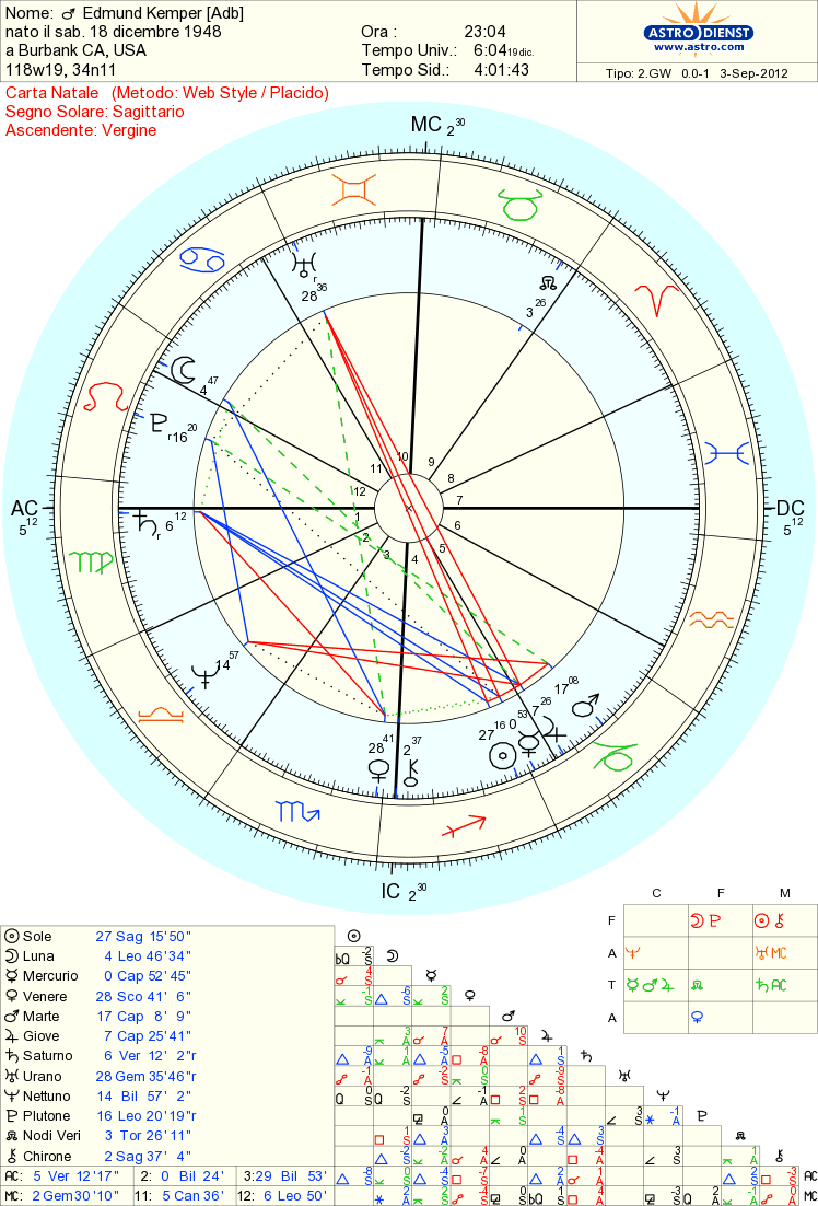 L odio che aveva maturato per la madre arrivò a tal punto che alla fine decise di prendersela con l’unica donna che riteneva responsabile di tutto..una notte entrò nella sua camera e la uccise a colpi di martello.La decapitò ,la stuprò da morta,e poi le strappò la laringe e la buttò nel trita rifiuti,che rompendosi gli fece esclamare:”Persino da morta continua a tormentarmi”Era alto più di due metri,dall’aspetto strano e goffo.Visse con questa madre che aveva un forte rancore con gli uomini,compreso lui,una specie di Medea. Di questo rapporto malsano porterà i segni tutta la vita. Kemper è una Personalità Fuoco-Terra ,con il Sole Sagittario in 4a casa,,ascendente vergine,Luna leone,GIOVE CAPRICORNO(4a), marte ,mercurio capricorno;la venere scorpione e chirone in sagittario sono congiunti, trigoni alla luna .GIOVE fa aspetto congiunto a marte,e mercurio,trigono a saturno in vergine,opposto a urano,quadrato a nettuno,congiunzione sole(larga)La luna fa un quinconce con Giove ,Marte si lega a urano e plutone