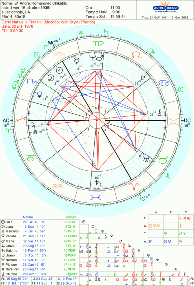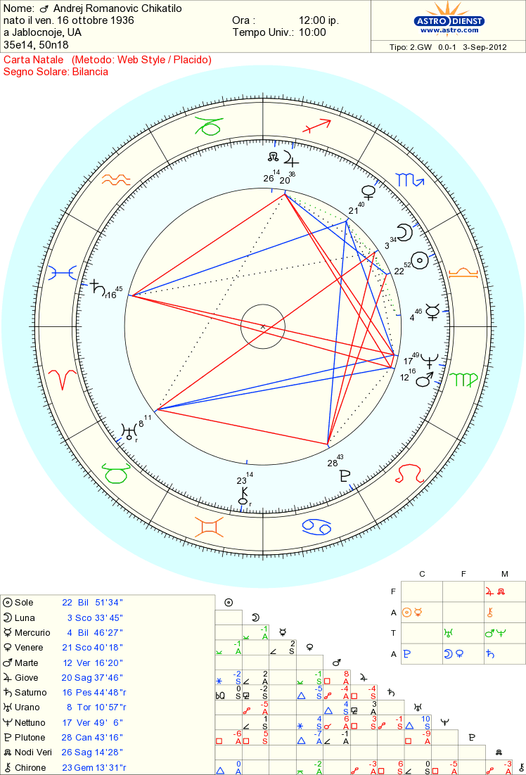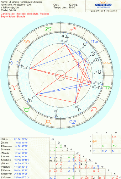Ma ANDREJ CHIKATILO ,il mostro di Rostov,supera tutti,Jack lo squartatore al suo confronto ,appare innocuo e senza talenti,la sua vita è stata un crescendo di frustrazioni e rabbia che quando sono esplosi lo hanno scaraventato nell’inferno ,insieme a tutte le povere vittime che ha straziato e che nell’inferno ci sono andate senza nessuna colpa,tranne quella di averlo incontrato.Analizzeremo la sua carta natale in maniera ravvicinata..