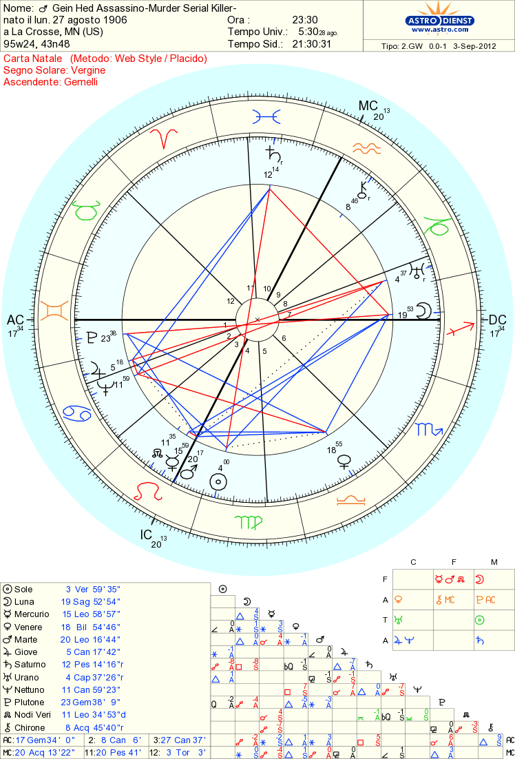 re..voleva una pelle di donna. Fu rinchiuso in un manicomio dove passò il resto della sua vita. Gein è un ascendente Gemelli con un Plutone congiunto opposti ad una luna in sagittario7a casa. Sempre in prima noi