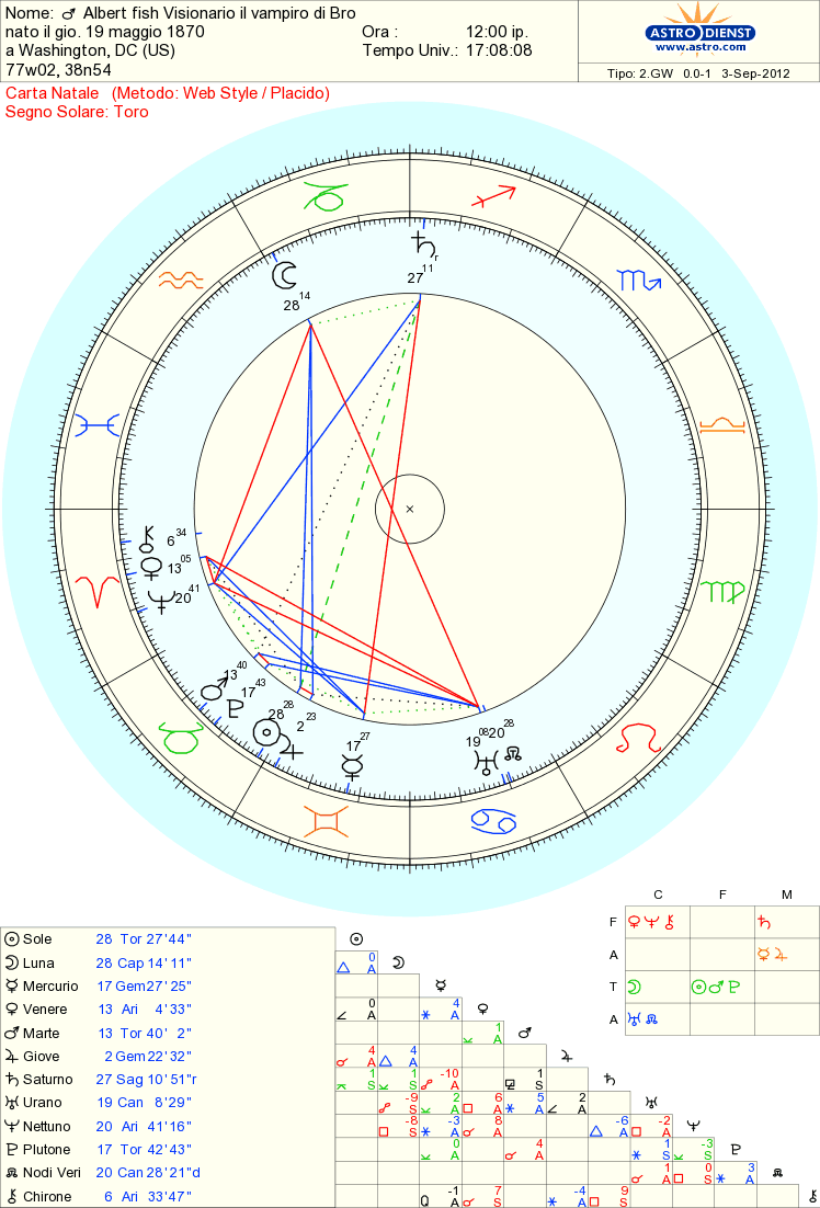 E’ una personalità Fuoco/terra con il sole in toro legato a marte/plutone in toro,congiunti a GIOVE IN GEMELLI .Saturno è in sagittario,opposto a mercurio gemelli forse in terza casa.:Fish sa affascinare e convincere tutti parlando,ha bisogno di comunicare,(pare che scrivesse centinaia di lettere oscene a sconosciuti) .Nettuno venere chirone congiunti in ariete;Con Saturno in sagittario,che trigona Nettuno..una bomba tutta fuoco per il suo delirio religioso. La luna in capricorno è congiunta a Giove, aspetto che si trova spesso in questa tipologia di cannibali,esprime al massimo quella Bulimia del male di cui parlo,non dimentichiamoci che è Toro, è un buon padre tenero e affettuoso con i suoi figli,ma spietato con tutti gli altri bambini.,che si fidano di lui(giove/mercurio gem.), Gli aspetti incriminati ci sono tutti,un nettuno imperante, un chirone molto stimolato,un giove /marte,un giove /nettuno,un marte /urano.