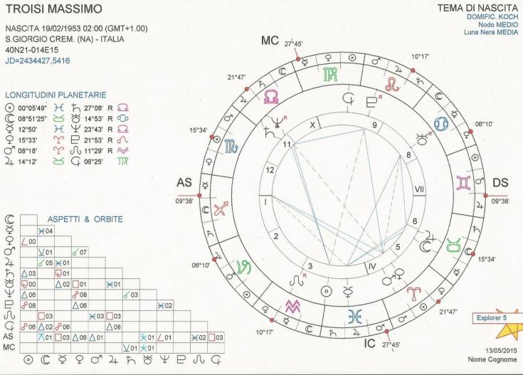 Massino Troisi, morto prematuramente a 41 anni per insufficienza cardiaca, nel pieno del successo professionale era un attore geniale con il dono dell’ironia e della simpatia. Di lui si dice che fosse un introverso e che morì “per infarto”, il suo tema natale dice ben altro, sia sul carattere, sia sulla malattia che l’ha portato alla morte.
