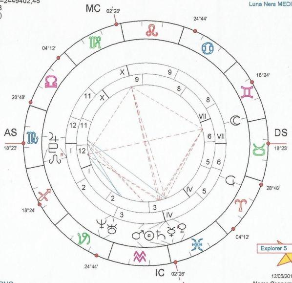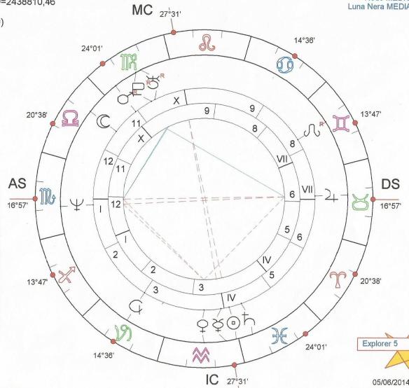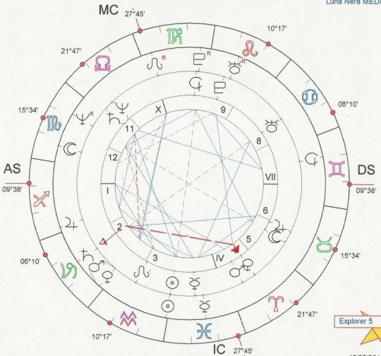 L’Ascendente di rivoluzione in nona casa indica il viaggio a Houston opposta a Mercurio. Marte e Plutone sono dissonanti e indicano cattiva riuscita dell’intervento anche a causa di Giove opposto a Venere.