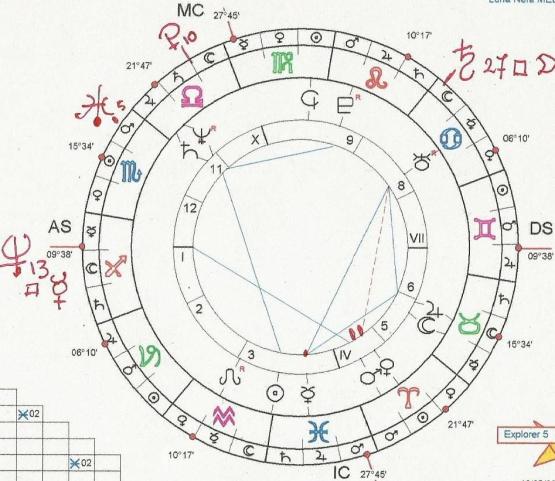 Nettuno sull’Ascendente Scorpione, sulla cuspide della dodicesima, quadrato a Venere e opposto al Sole. Anche rispetto ai transiti la posizione di Nettuno – mutazioni è preoccupante perché in Scorpione forma una netta opposizione con la Luna e in seguito con Giove in sesta. Ebbene sappiamo che Nettuno simbolo delle mutazioni, governa lo stile dei batteri e dei virus che hanno la capacità di mutare velocemente per sopravvivere. In questo periodo inizia il calvario del soggetto che comincia ad avvertire i primi sintomi di debolezza e mancamenti dovuti al danneggiamento della valvola aortica.