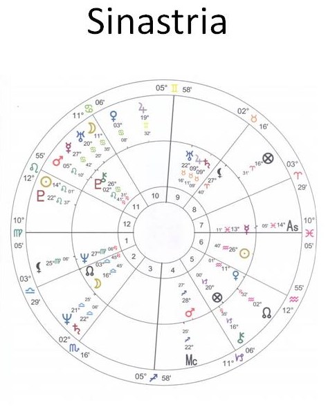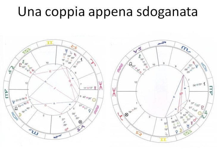 Da notare la fortissima complementarietà dei temi (Ascendente opposti, Soli opposti, Luna in quadratura).