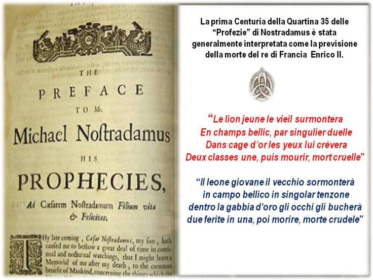 La prima Centuria della Quartina 35 delle “Profezie” di Nostradamus è stata generalmente interpretata come la previsione della morte del re di Francia Enrico II.