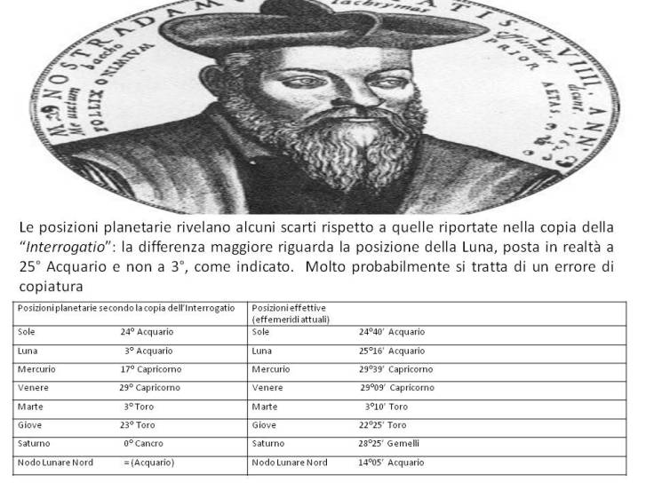 Le posizioni planetarie rivelano alcuni scarti rispetto a quelle riportate nella copia della “Interrogatio”: la differenza maggiore riguarda la posizione della Luna, posta in realtà a 25° Acquario e non a 3°, come indicato. Molto probabilmente si tratta di un errore di copiatura.