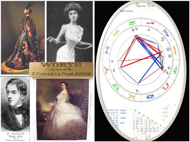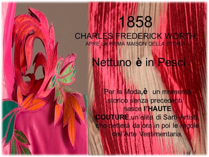 Per la moda,è un momento storico senza precedenti : nasce l’HAUTE COUTURE, un’elite di sarti-artisti, che detterà da ora in poi le regole dell’arte vestimentaria. Nacque la prima Sartoria,della storia,e il primo couturier padre di questa innovazione è CHARLES FREDERICK WORTH (13 ottobre 1825 Boume, Inghilterra),una bilancia,con Urano e Nettuno in Capricorno e con Plutone in Ariete. “Questo individuo piccolo asciutto ,nervoso tutto vestito di nero ,guarda le donne adagiate sui divani della sua “Bottega” e si rivolge loro ,sigaro in bocca :”camminate,giratevi! Bene!Tornate fra una settimana e vi preparerò un abito che vi starà bene”.
