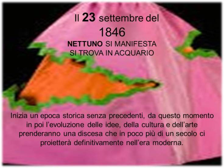 È Il 23 settembre del 1846 quando Nettuno, si manifesta e si trova proprio in Acquario:inizia un epoca storica senza precedenti ,da questo momento in poi l’evoluzione delle idee ,della cultura e dell’arte prenderanno una discesa che in poco più di un secolo ci proietterà definitivamente nell’era moderna. La sua scoperta accompagna tutti i moti di ribellione del 48:il mondo tutto cerca la Libertà dall’ oppressore, fu definita” a primavera dei popoli”. I giovani ribelli, sono una delle realtà più vive e importanti nel corso dell’intero processo risorgimentale. “Erano giovani erano forti e sono morti” per un ideale di libertà più importante della stessa vita!.