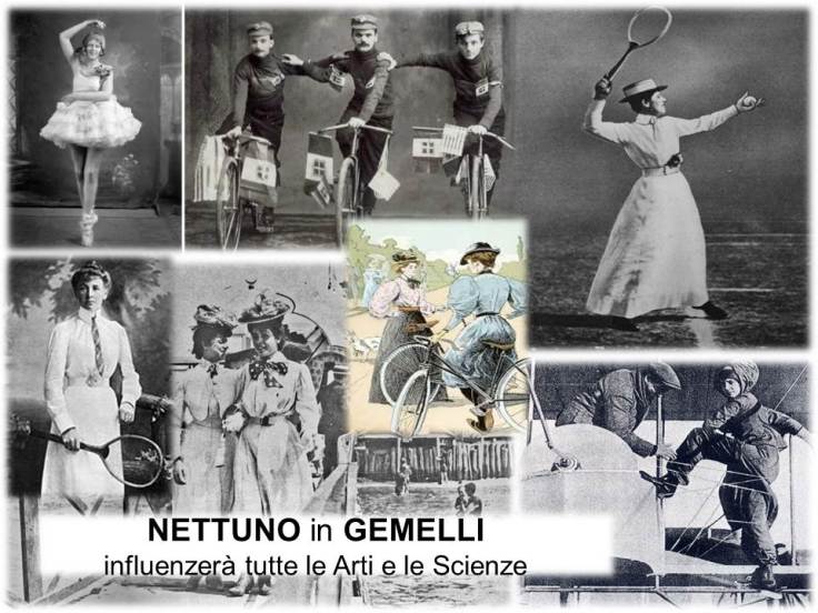 Domina l’aria, Urano è in Bilancia, anche lui nella sua esaltazione, scarseggia la terra,e la metamorfosi si lega a Mercurio. Lo Sport si diffonde coinvolgendo per la prima volta anche le donne, la bicicletta diventa il passatempo preferito,lo stile è razionale. Nasce anche il tennis,uno sport che usa le braccia,simbolo dei Gemelli. Entriamo finalmente nel novecento, nell’epoca del MOULINE ROUGE e del CAN CAN. Parigi è tempestata dei manifesti di TOULOUSE LAUTREC. NETTUNO è in CANCRO(1901-02/1915-16) e PARIGI,la Ville Lumiere, diventa la CAPITALE DELLA MODA.