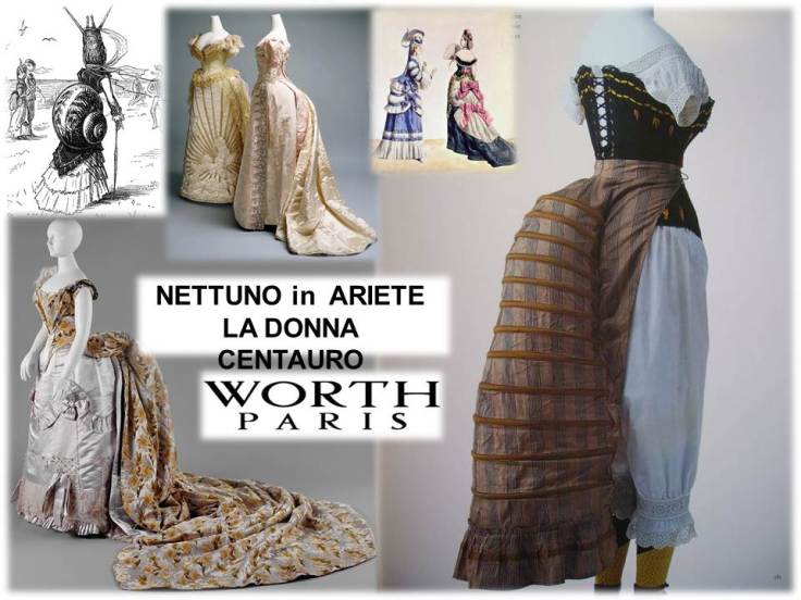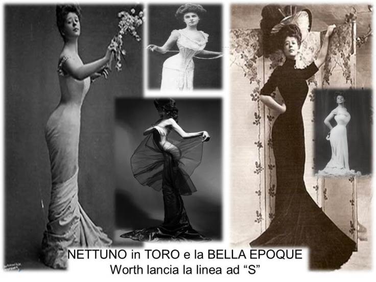 E quando NETTUNO entra in ARIETE (1861/62-1872/75) e passa sul suo Plutone, l’energia del suo Marte in Vergine si applica alla volontà di metamorfosi, ecco che la vita si riempie di impeto e baldanza ,alla ricerca di un valore ,una fede. La sensibilità nettuniana si accende di ideali per cui vale la pena combattere, l’Artista si ribella ad ogni convenzione e lancia una figura femminile che arriva a somigliare ad un centauro senza gambe. Gli abiti sono tutti protesi nel didietro indossati giacche maschili e gilet. E per la prima volta nella storia,Worth invita le donne ad adottare un capo maschile. Ma non finisce qui. Con l’Epicureo “gusto pieno della vita” che ha portato il transito di NETTUNO in TORO(1874/75- 1887/88) e la BELLA EPOQUE, Worth lancia la linea ad “S”una figura femminile altezzosa e slanciata, che accende i riflettori sul “collo da cigno”(ovviamente simbolo del Toro),mentre la vita si assottiglia fino a sparire.
