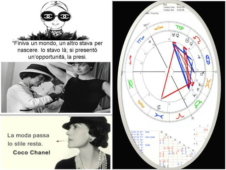 Il tema natale di Chanel è straordinario, cito in questa sede,come esempio,l’aspetto di Sestile che Giove in Cancro in settima casa forma da una parte,con Nettuno in Toro,e dall’altra con Urano/Mercurio in Vergine. Mentre in quinta , Plutone è in Gemelli, in stretta congiunzione con Chirone,come a dirci che l’esplosione e l’accettazione della sua creatività sarebbe stato il solo modo di guarire una ferita enorme, trasformando i lutti e gli abbandoni e il non aver avuto figli,nel creare e partorire se stessa a vantaggio di tutto il mondo. E il lavoro per lei fu passione,creare abiti per le donne un’ancora di salvataggio. Una personalità capace di “sentire”( Luna Pesci), percepire, e cogliere tutte le opportunità. Coco non disegna, Coco nel suo dramma “vede” il proprio inferno e lo porta in terra ferma. Prende il tessuto e direttamente lo scolpisce sul manichino,unico e solo compagno ad non averla mai abbandonata,il sogno di una donna libera da ogni struttura e dipendenza.“I vestiti che creò cambiarono il modo in cui le donne venivano guardate e il modo in cui esse guardavano a se stesse”(Times). “Era acuta, chic, e con i nervi a fior di pelle”, la sua straordinaria capacità di tradurre il Divenire del Femminile nella sua significanza più alta, e quel sottile caparbio concetto di modernità le permisero di entrare nell’immaginario collettivo e diventare a tutti gli effetti una delle donne più importanti del Novecento e di tutti i tempi . Coco Chanel ha creato la nuova uniforme della donna moderna”(Vogue), accorcia le gonne , sposta in basso il punto vita ,abolisce il busto, impone i capelli corti alla maschietta,lancia il Jersey,il cardigan, i completi in maglia con le gonne a pieghe piatte,i pantaloni,“le petit robe noir’,il celebre tubino nero,le scarpe a punta, la bigiotteria. Scelse tessuti e articoli d’abbigliamento maschili, si appropriò anche dei vestiti sportivi come parte del linguaggio della moda. L’eleganza per lei significava “semplicità”, “ridurre il tutto alla più chic costosa raffinata povertà.” Di Poiret rifiuta i barocchismo e i fronzoli, mentre più tardi di Dior dirà che addobba delle poltrone”. Era uno “schizzo di cianuro”,(marte in gemelli quadrato a mercurio urano in vergine). Non risparmiava giudizi e critiche. Era fortemente avanti nei tempi,conscia del suo potere. L’unica stilista che amava essere copiata,nulla lasciato al caso,come la scelta di un Logo che avrebbe influenzato tutte le generazioni future .Ma uno degli elementi che le assicurarono l’immortalità non fu un vestito, ma una specie di “oro liquido”, lo CHANEL N° 5, il primo profumo a portare il nome di uno stilista. Chiude durante la 2° Guerra Mondiale per riaprire il 5 febbraio del 1954, all’età di 71 anni con il tailleur in tweed profilato, la cintura dorata ad anelli,la borsa impunturata con la catena d’oro. Segni indelebili di uno stile che a tutt’oggi impera in tutto il mondo: Plutone in leone era sul sole, Urano su Giove in cancro,e Nettuno in bilancia in sestile perfetto al sole. Morì il 10 gennaio del 1971. ”Mi uccidera’ la domenica”amava dire. E così fu.. Tutto il resto è datato mentre di lei sopravvive l’eterno significato di uno stile senza tempo.