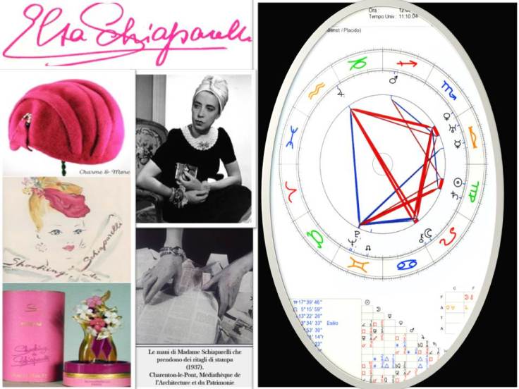 Un Nettuno /Plutone congiunti in Gemelli, Urano in Bilancia, un Giove Acquario trigono a Nettuno,e una Luna/Chirone Leone. Nel 1934 quando apri la sua Maison a Parigi ,Giove si trovava su Urano ,mentre Nettuno, superato il suo Saturno in Vergine e il quadrato a Nettuno di nascita, si avvicina al Sole. Si dissolve tutto il passato e nasce una donna nuova,da snob aristocratica e legata al ceto sociale e ai suoi doveri , esplode la sua creatività,grazie anche all’incontro con Poiret . La “Follia” del genio nascosto inonda i suoi accostamenti di colore di grande effetto,gli accostamenti di stoffe sono forti ,di rottura, e le forme dei suoi abiti, totalmente rivoluzionarie. Più che una stilista ELSA è un artista. Coco Chanel dovrà dividere in quegli anni lo scettro con lei. “Per Elsa il vestito non è mai una maschera, lei vuole indossare la propria identità” Sono particolare ,sono come tutte e tuttavia sono io” ama dire. Collabora con i più importanti nomi del surrealismo e del cubismo e “ stupisce costantemente per le sue creazioni,nelle quali si fondono ironia,citazioni e sperimentazioni”. Utilizza stoffe simili a plastica e carta , i suoi accessori hanno le forme più stravaganti.